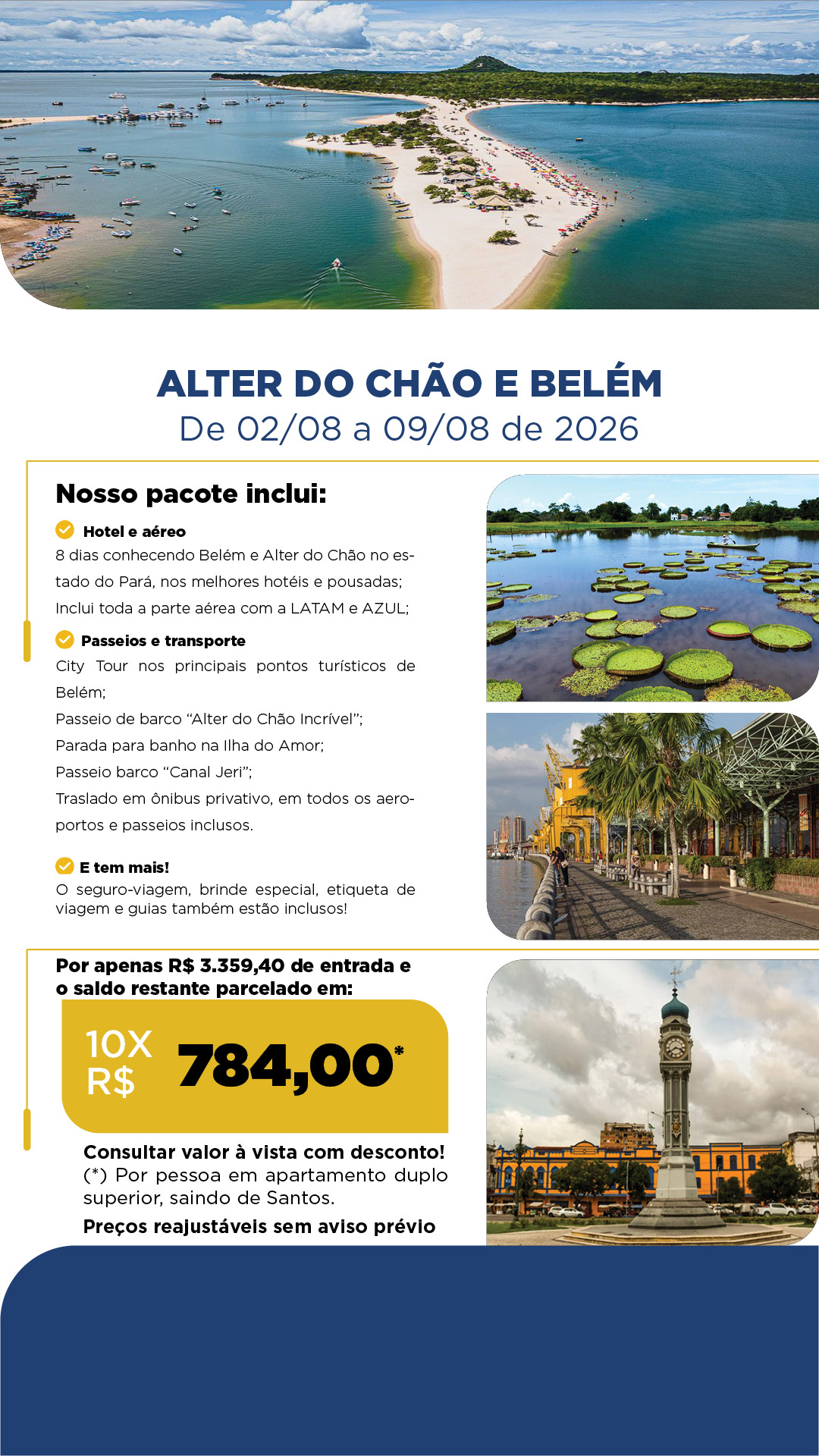 O pacote está completo e já inclui todos os trechos aéreos com as companhias Latam e Azul, saindo de São Paulo, nos melhores horários, todas as taxas aéreas e custo para despacho das malas de 23kg em todos os trechos. Inclui também ônibus com ar-condicionado exclusivo para o grupo para em os transfers de aeroporto e em todos os passeios, city tour em Belém, passeios pelos principais pontos turísticos de Alter do Chão com barcos exclusivos para o nosso grupo nos passeios do receptivo mais renomado da região e muito mais!