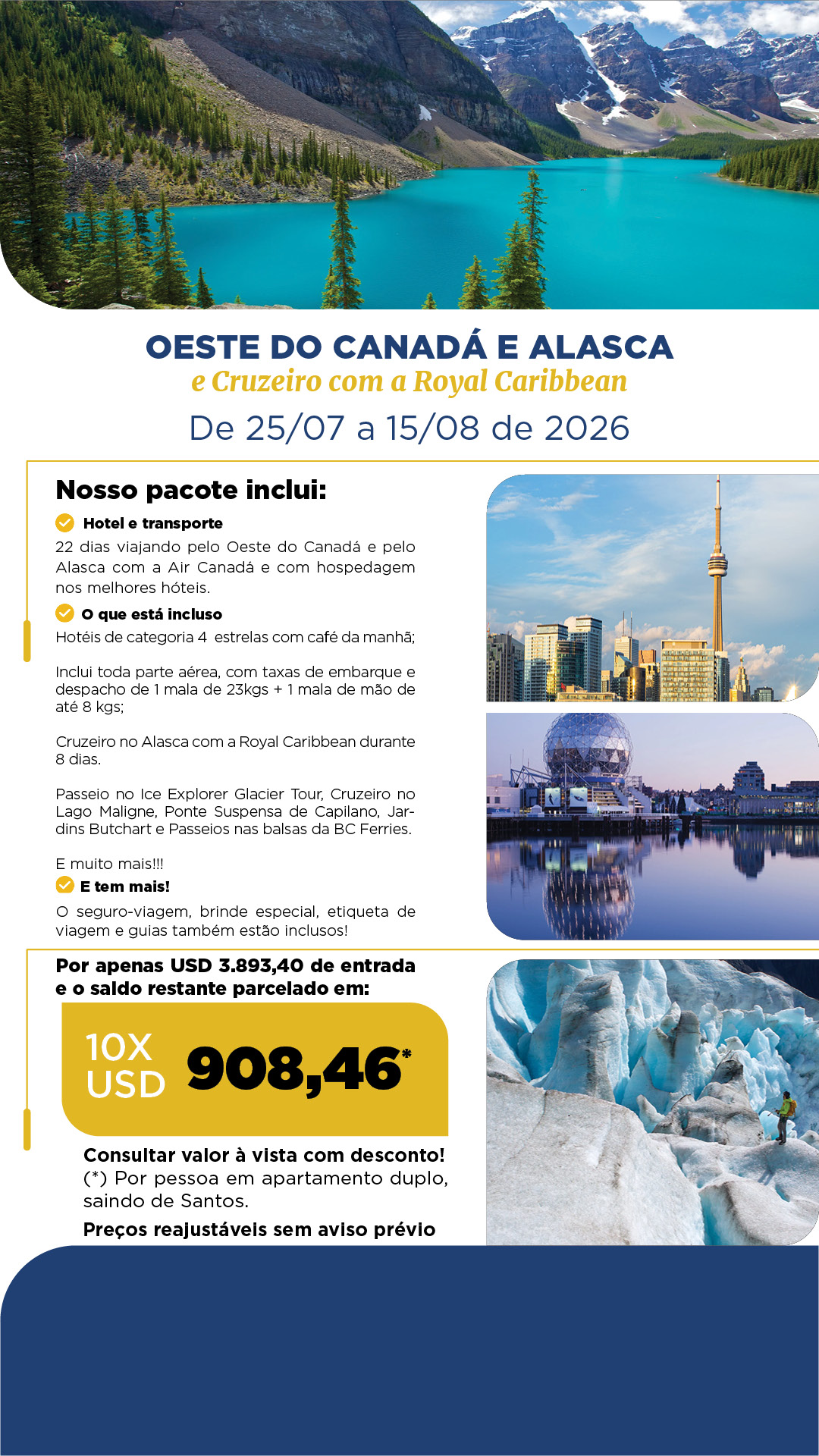 Serão 22 dias de viagem pelo Oeste do Canadá e pelo Alasca, percorrendo algumas das regiões mais impressionantes da América do Norte. No Canadá, o roteiro contempla cidades modernas como Vancouver, além de estradas cênicas, montanhas imponentes, lagos de águas cristalinas e parques nacionais, como as regiões das Montanhas Rochosas, com paisagens que parecem cartões-postais.