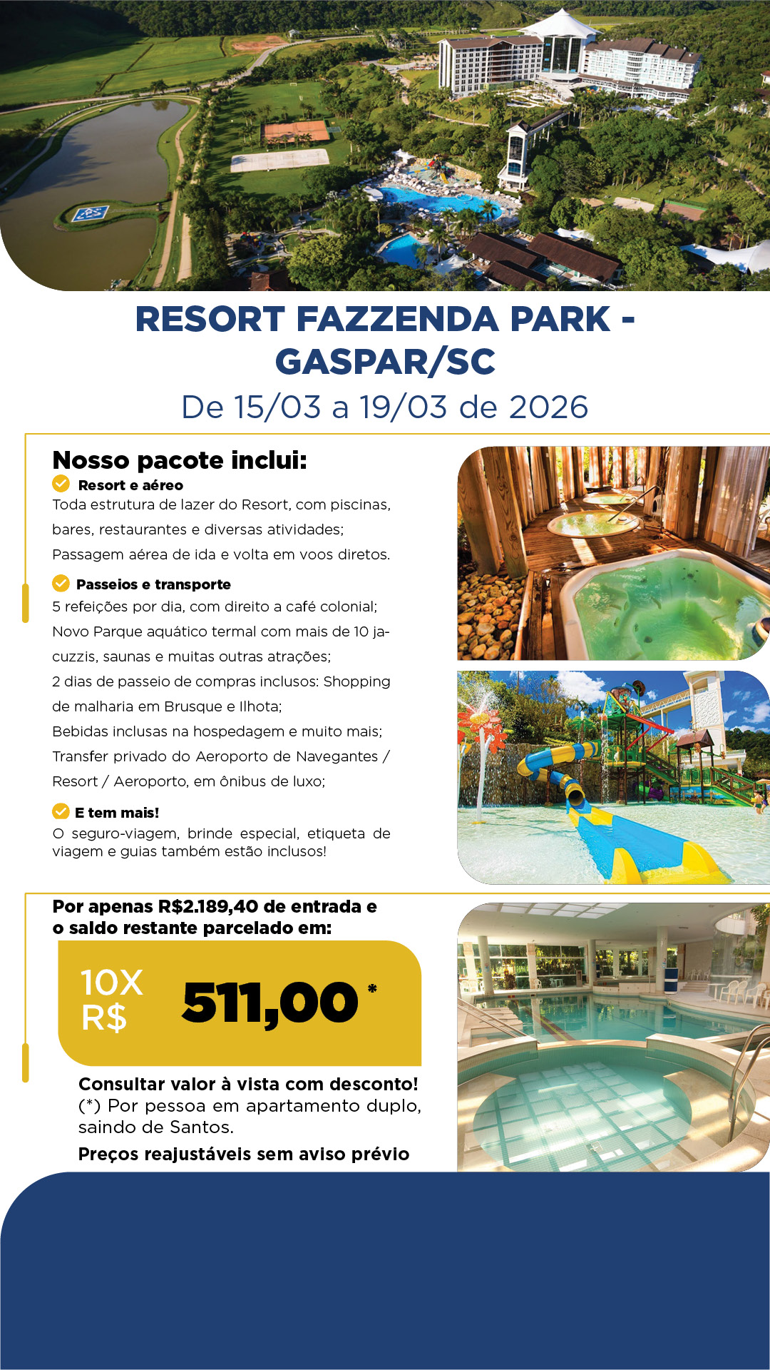 Além de tudo isso, ainda visitaremos o Shopping da Malharia em Brusque e Ilhota e teremos em todas as noites muitos shows, música e diversão.
