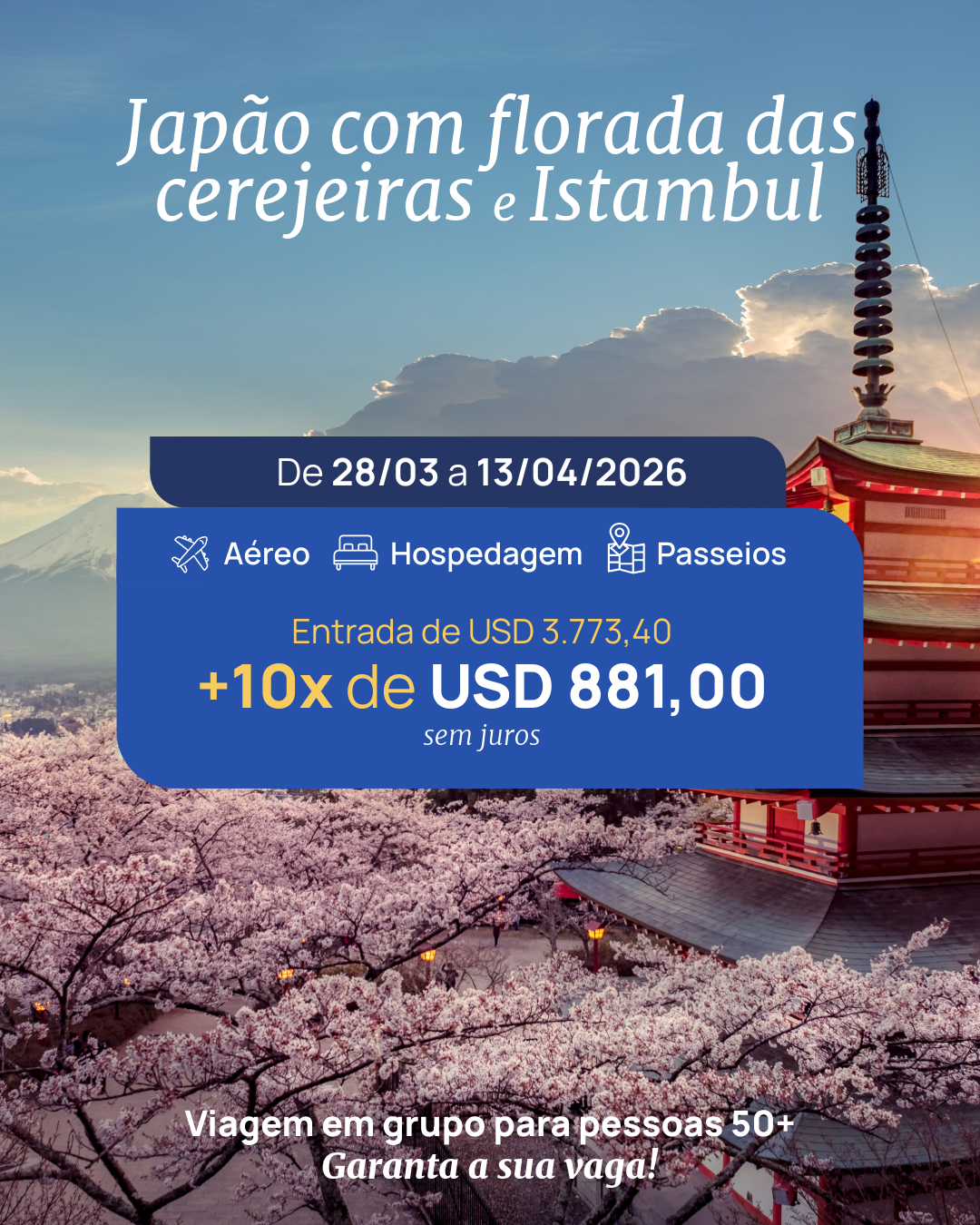 O período da cerejeiras é extremamente concorrido, pois milhares de pessoas do mundo todo tentam ir ao Japão ter essa experiência única. Vale destacar que antes e depois do Japão, faremos paradas em Istambul, com hospedagem 5 estrelas e visita aos principais pontos turísticos da cidade.