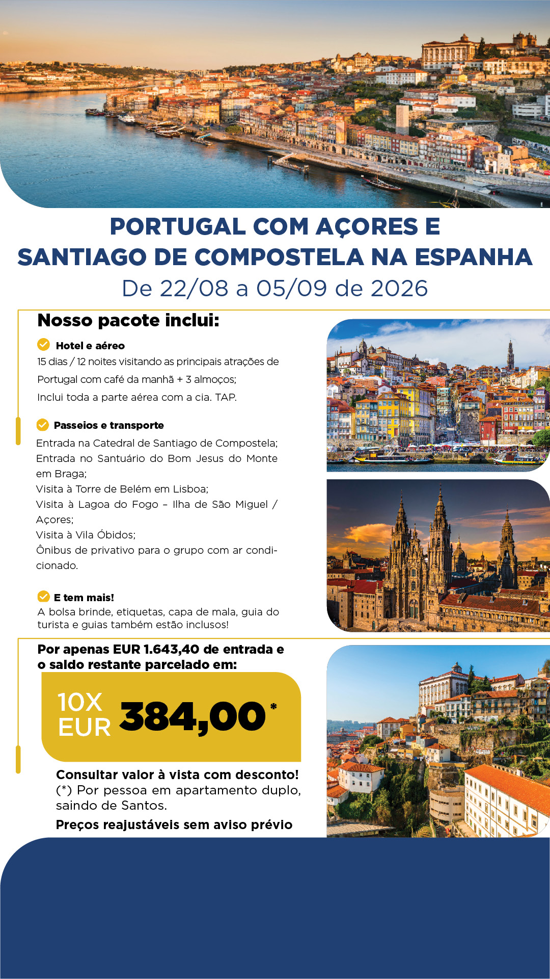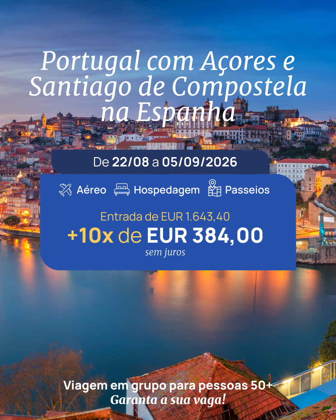 Como já é de costume, nosso pacote de viagem é completo! Conheceremos Portugal, através de uma viagem de 15 dias contará com passeios, guia local, transporte em ônibus luxo com ar-condicionado e muito mais já inclusos no pacote!